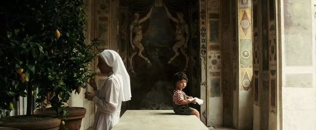 《绝美之城》如其名一般,用一组组长镜头和荷马史诗《奥德赛》式的“旅程模式”叙事风格,展示出罗马的“绝美”。电影不吝啬时长地展现了罗马城的建筑场景及夏日风貌,灰白色的立柱围栏、石膏线条装饰的棕黄色墙面,掩藏在深浅不一的婆娑树影间,流露出亘古不变的雍容与华美。