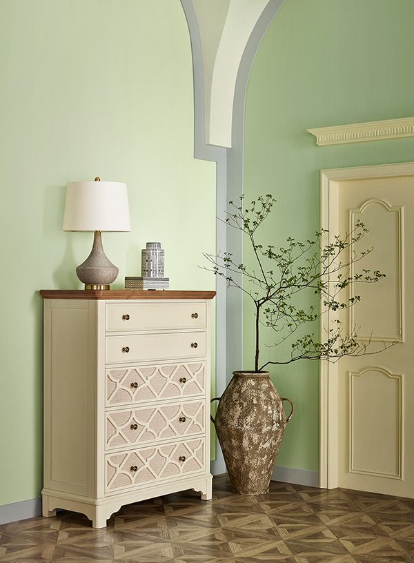 做旧的金属圆形把手的斗柜,在光线下折射出古铜色泽,柔和的曲线造型增添了空间的律动感。鼠尾草绿的整体空间中,点缀薰衣草紫的浪漫,喧嚣中尽享一方温柔恬静。