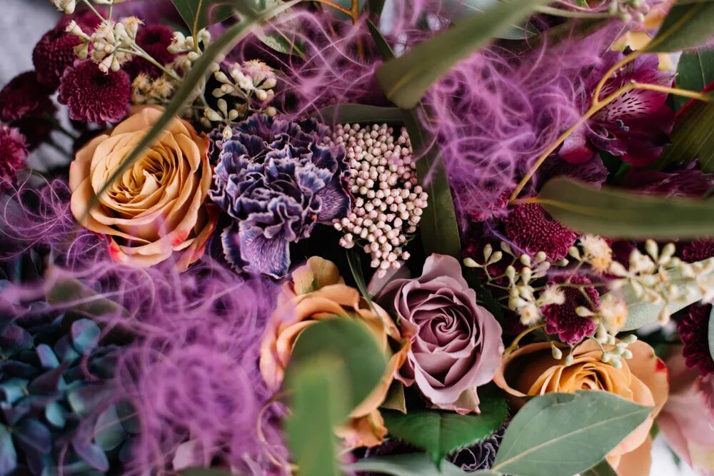 不同材质的混搭,可以丰富花束整体的层级及形态美感,发挥出更多变的创意灵感。将羽绒丝、风干植物等素材一一染色,别致的色彩,也象征这份爱意的独一无二。