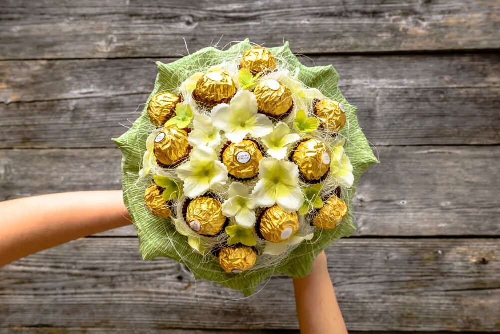 追求浪漫也不忘实用,那现今最流行的“美食花束”不失为一种讨巧的选择。以巧克力、糖果甚至是水果替代原本的花朵,巧克力及糖果多彩的包装纸,一样可以呈现绚丽的视觉效果。每拆开一颗,都像打开一份礼物般的惊喜。